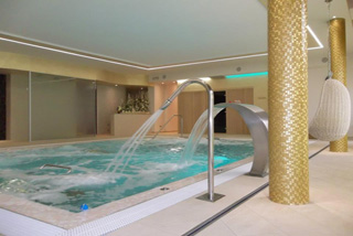 Area benessere con piscina, saune, bagno turco, docce emozionali e grotta di sale, con possibilità di prenotare massaggi e trattamenti estetici.